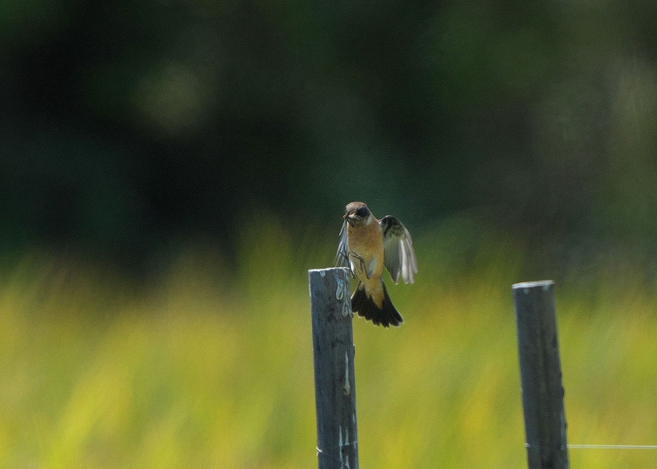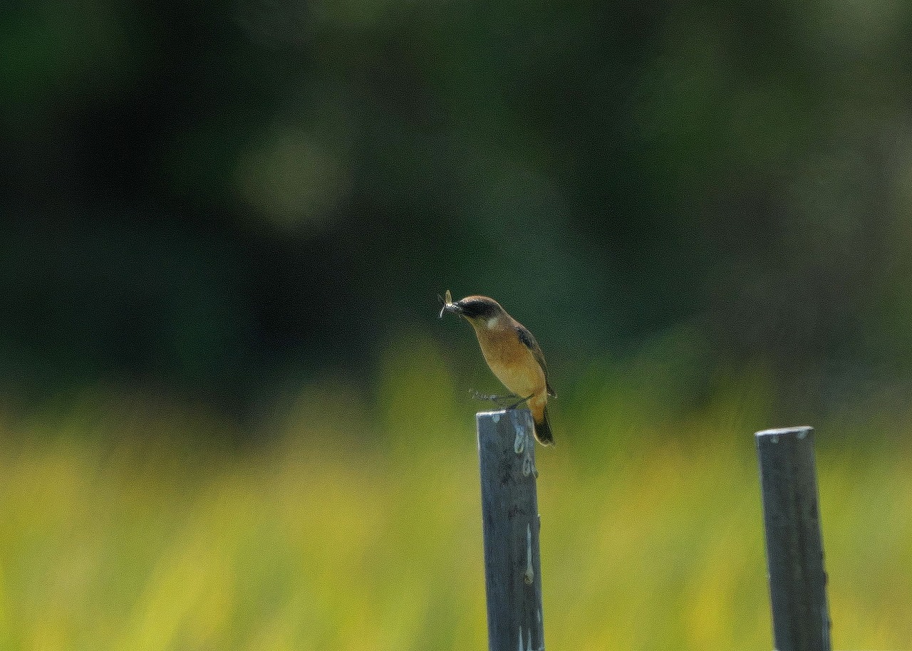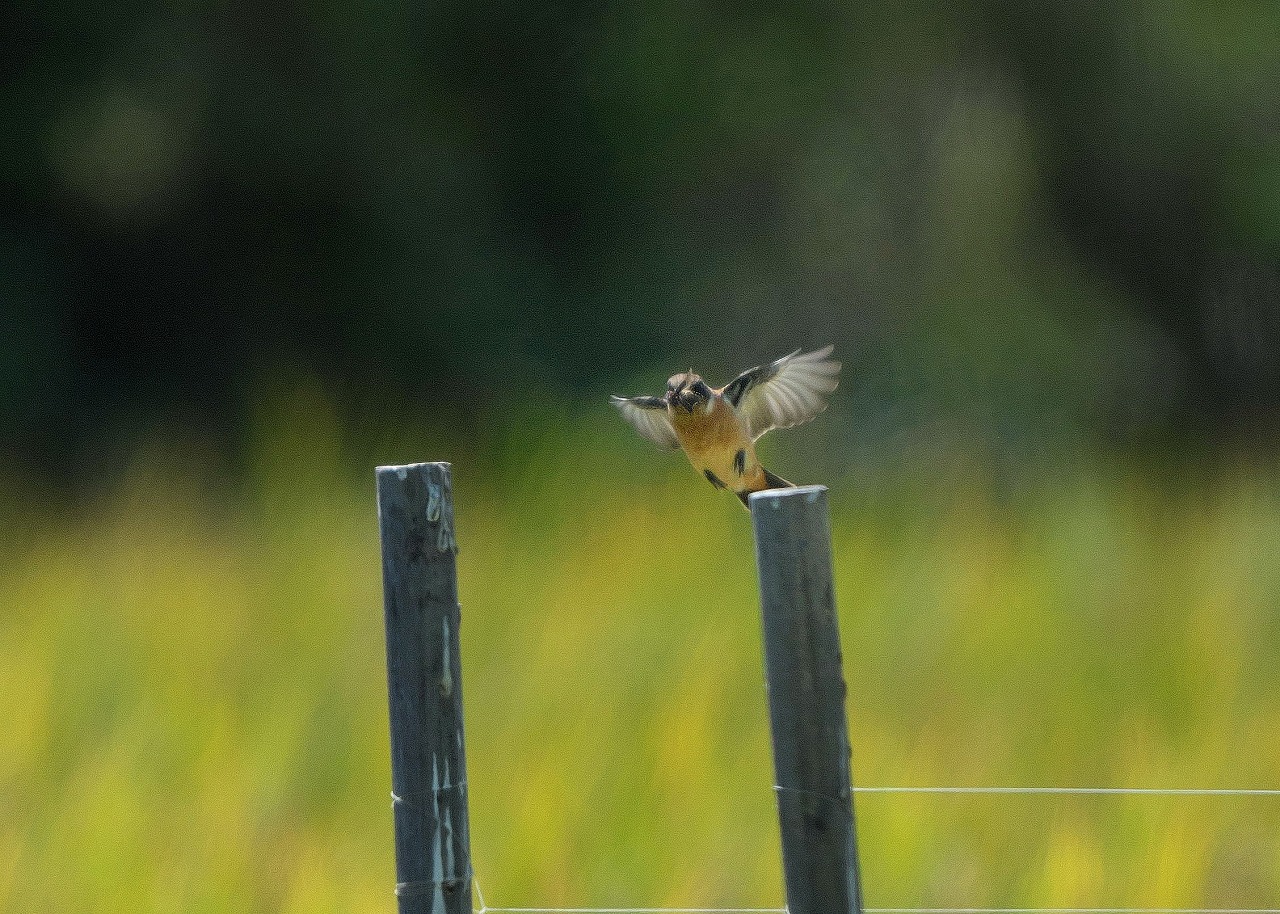 昨日のノビタキ、エサを捕って杭に戻る飛び付きを狙いました。