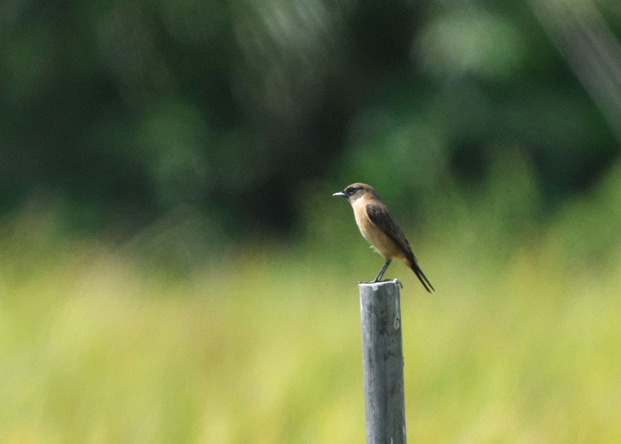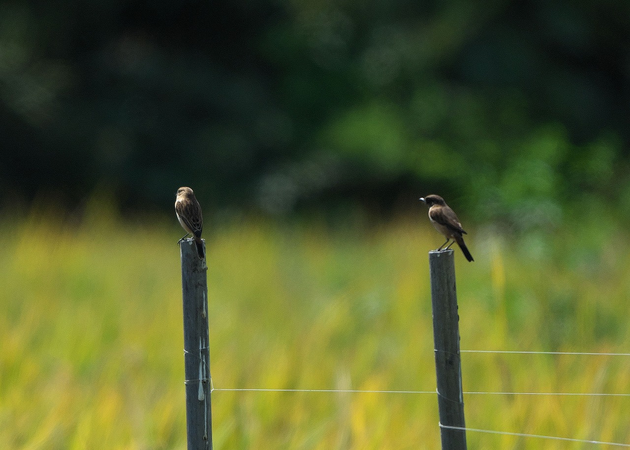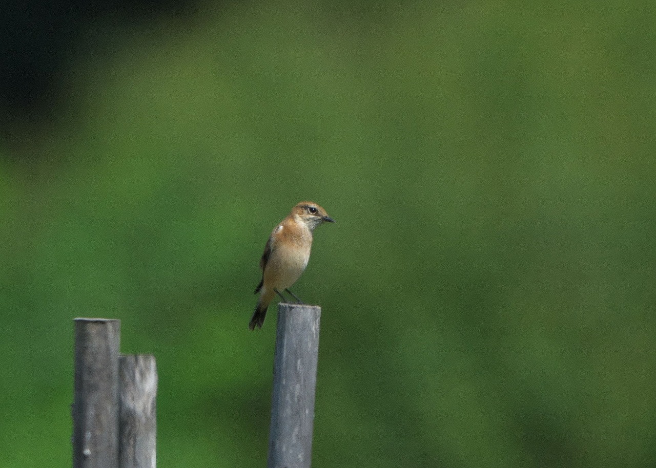 昨日のノビタキ、エサを捕って杭に戻る飛び付きを狙いました。